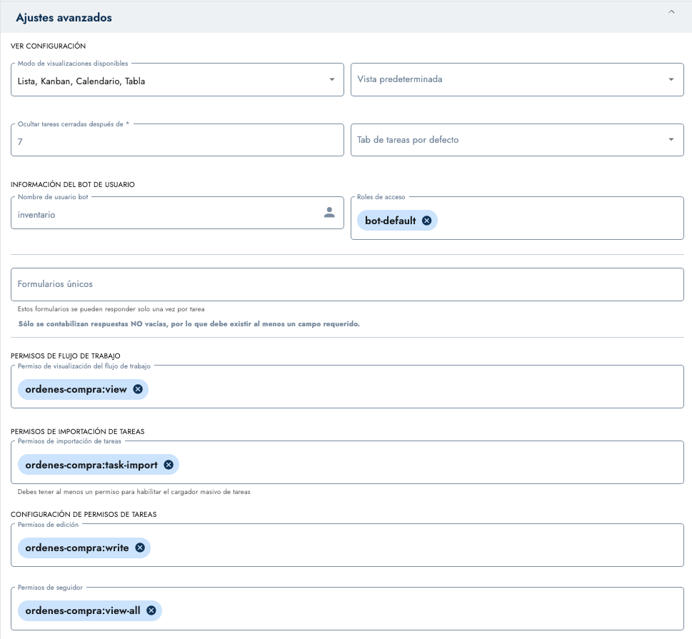 Ejemplo: un flujo llamado Órdenes de Compra tendría el prefijo de ordenes-de-compra , pero a mi me parece muy largo, así que lo dejaré como ordenes-compra. Por lo tanto, sus permisos quedarían así: