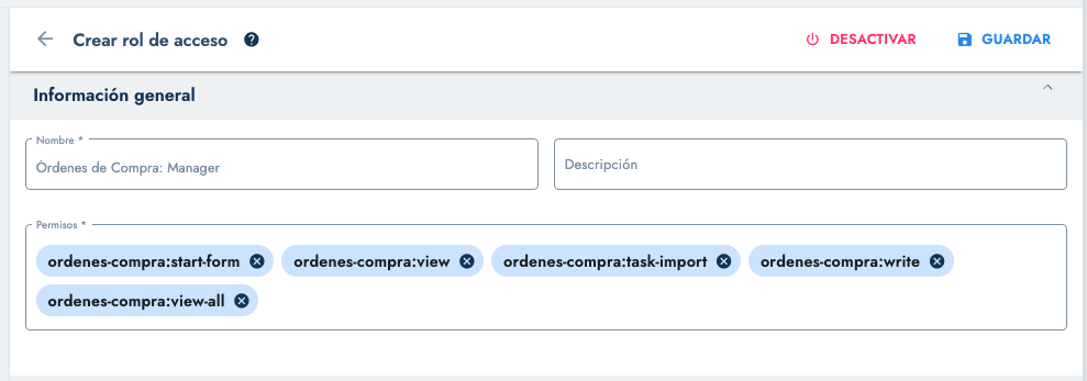 Órdenes de Compra: Solicitante→ordenes-compra:view+ordenes-compra:start-formÓrdenes de Compra: Aprobador→ordenes-compra:viewÓrdenes de Compra: Visualizador→ordenes-compra:view+ordenes-compra:view-all
