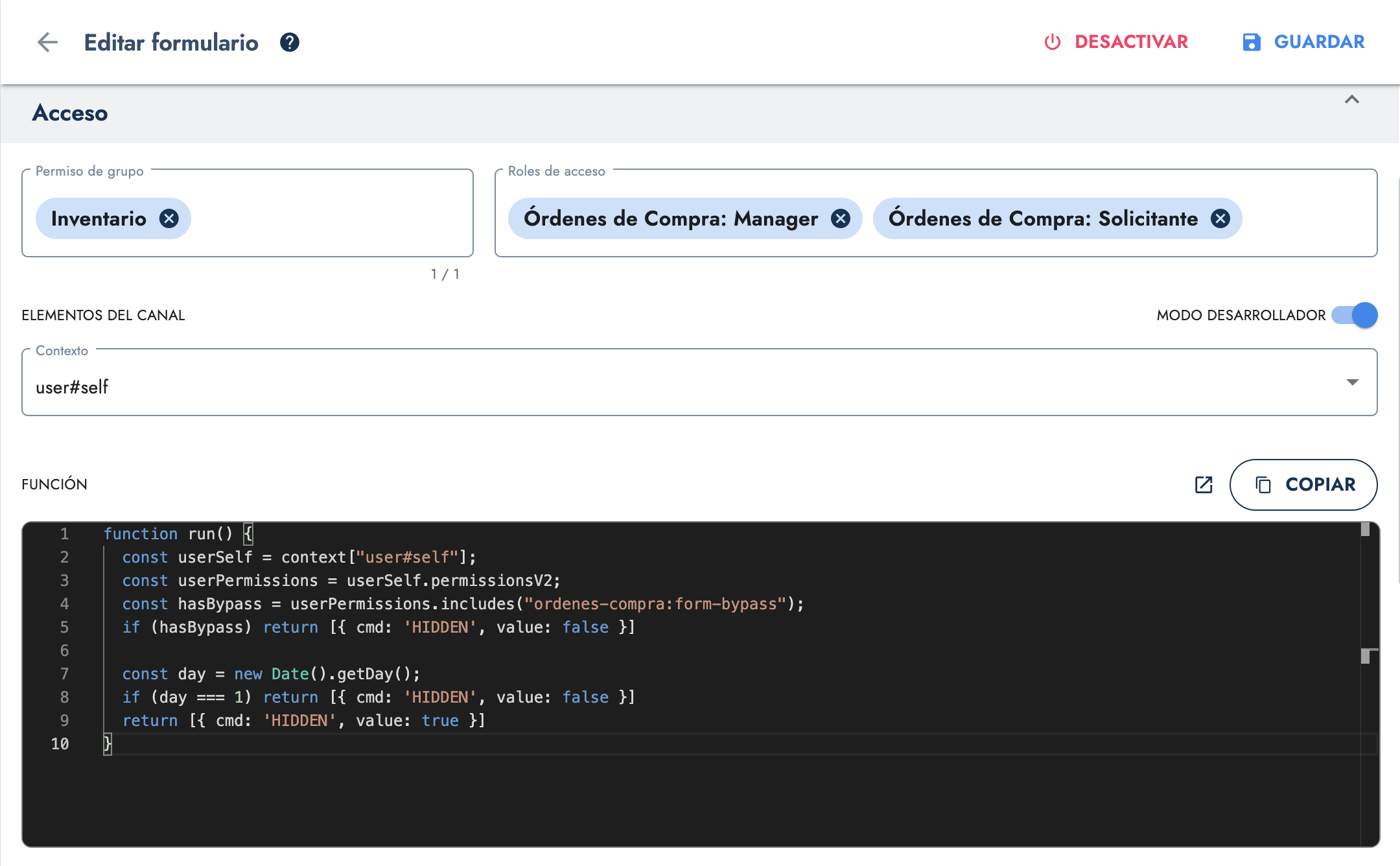 Por si no lo sabías, los formularios de Cotalker esconden un nivel de magia más complejo: el modo desarrollador (developer mode). Cuando se activa, aparece un nuevo campo para ingresar código JavaScript que evalúa reglas de negocio específicas y decide si el formulario puede visualizarse o no.
