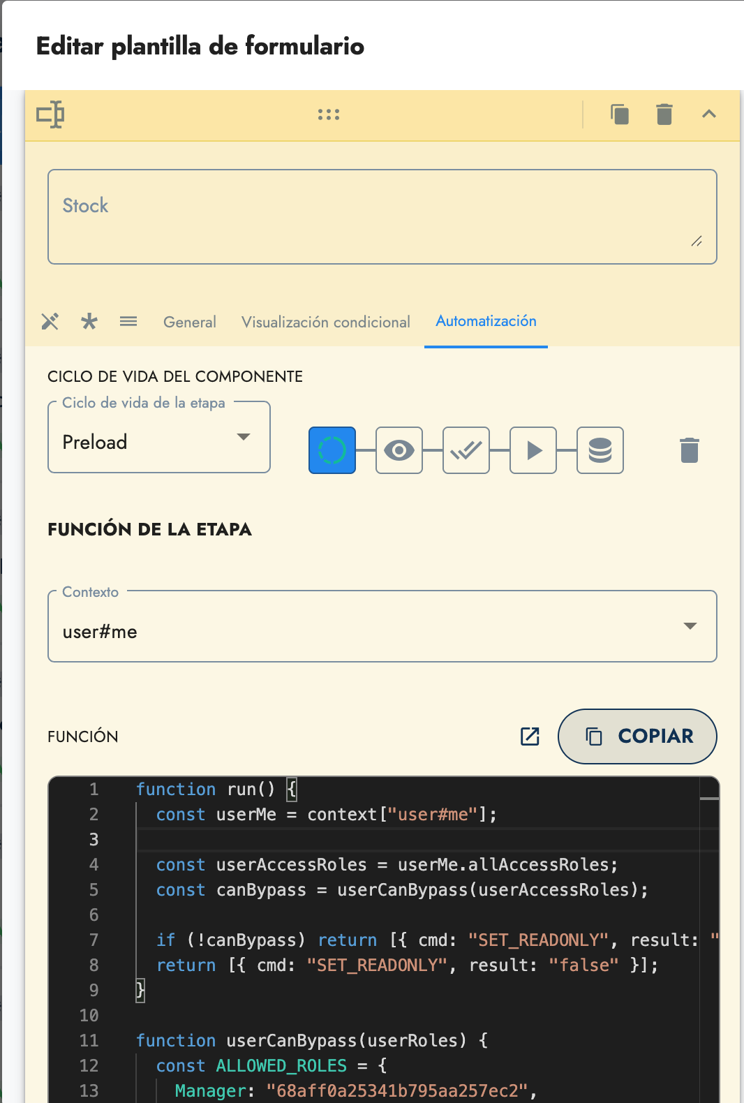 ¿y cómo se hace esto? Implementando un bypass en el código. El developer mode permite añadir contextos, que otorgan acceso a información de la tarea en ejecución o del usuario que abre el formulario. Necesitamos justamente ese contexto del usuario para extraer sus permisos y comprobar si posee el form-bypass. Lo que nos da algo similar a esto: