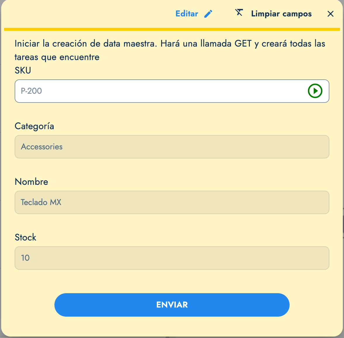 Imaginemos este caso real: Un usuario ingresa un SKU en el formulario, haciendo que automáticamente se precarguen los campos de categoría, nombre y stock como solo lectura.