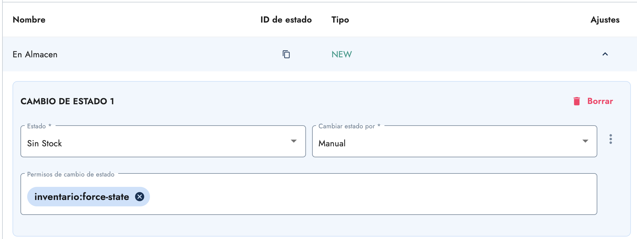 Por convención, llamaremos a este nuevo permiso con el sufijo de force-state, lo asignamos al rol Manager y añadimos un cambio de estado manual con el nuevo permiso creado.