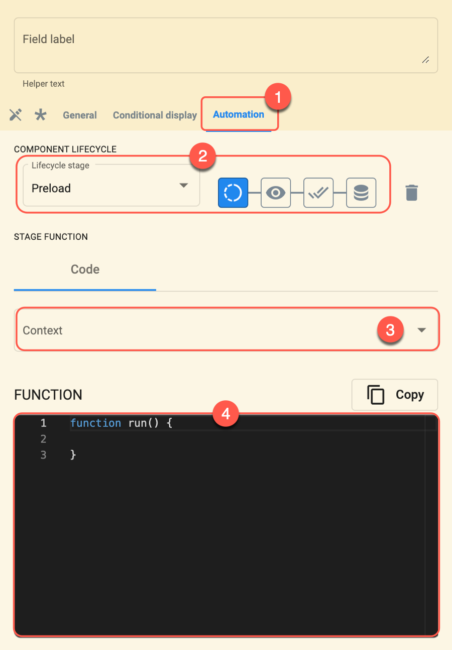 El preload se ejecuta apenas se abre el formulario y su función principal es precargar valores en los campos. Pero su magia no termina ahí: también permite marcar campos como solo lectura (read-only), precargar otras questions e incluso realizar cálculos previos a la interacción del usuario.